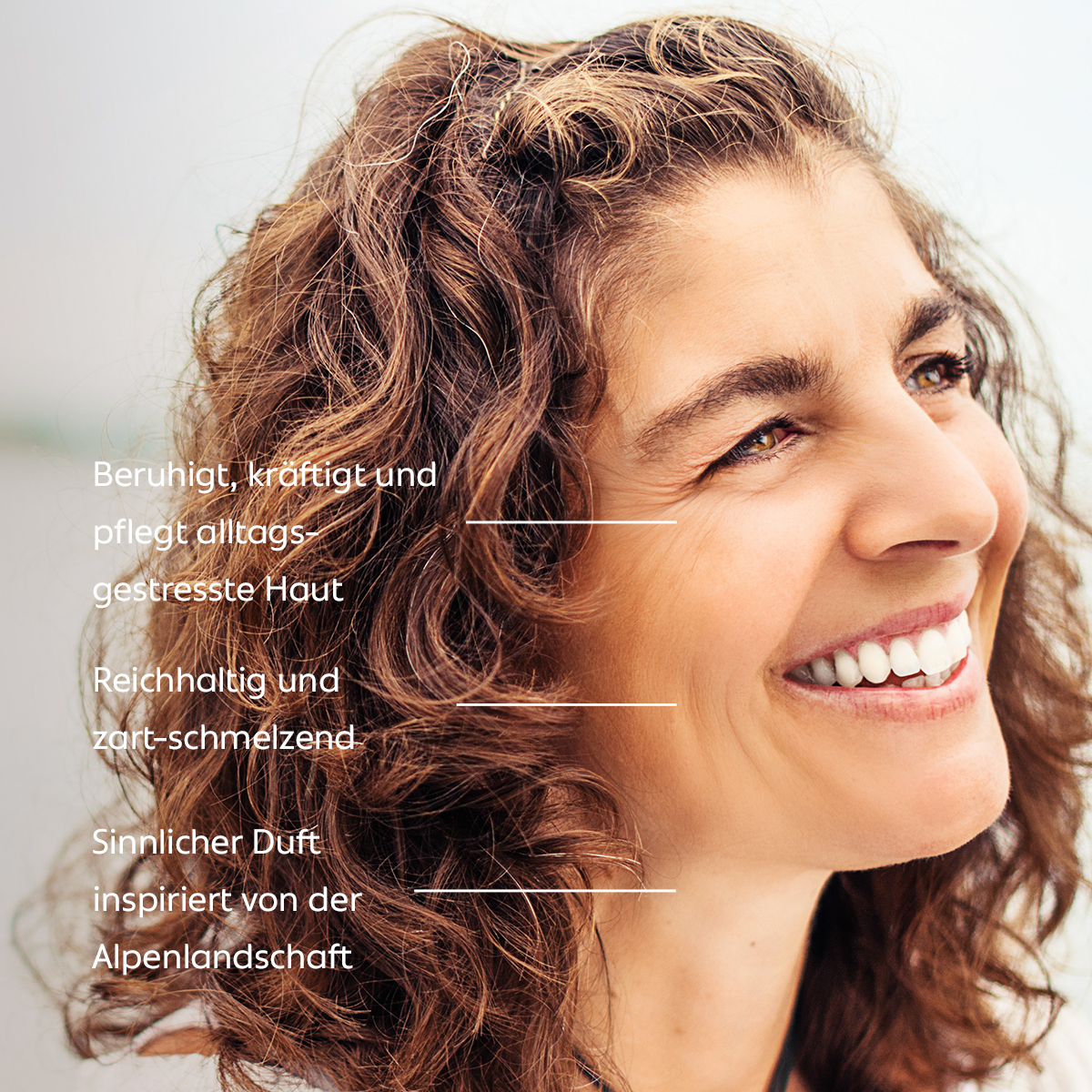 Die ALPINE BALANCE KÖRPERBUTTER verbindet reichhaltige Pflege mit dem Gefühl von Frische und Natürlichkeit. Ihre zart-schmelzende Textur pflegt intensiv, zieht schnell ein und hinterlässt ein geschmeidig weiches Hautgefühl. Kostbare Alpenblumen-Extrakte unterstützen die Haut dabei, sich zu regenerieren und ihre natürliche Balance zu bewahren.