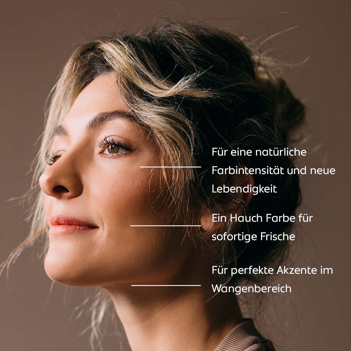 Ein Hauch Farbe auf den Wangen verleiht dem Gesicht sofort Frische. Tragen Sie das Rouge mit einem weichen Pinsel auf den höchsten Punkt der Wangen auf und verblenden Sie es sanft in Richtung Schläfen. Für ein besonders strahlendes Finish anschließend etwas Highlighter über dem Blush platzieren – das hebt die Wangen optisch an und bringt Licht ins Gesicht.