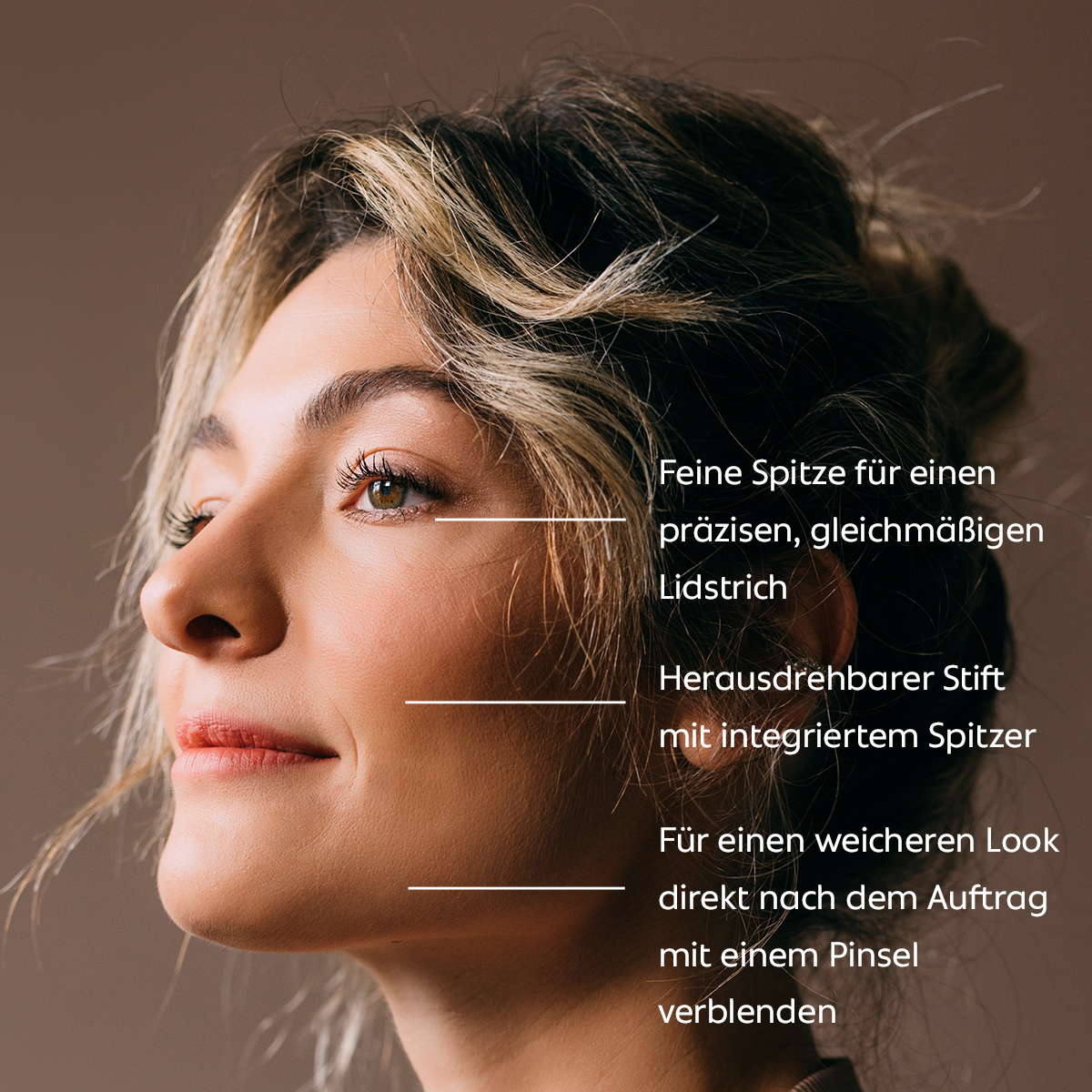 Den Eyeliner möglichst nah am Wimpernkranz entlangführen – für eine sanfte Betonung oder einen ausdrucksstarken Lidstrich. Die feine Spitze erlaubt präzises Arbeiten, auch für zarte Linien. Tipp: Für einen weicheren Look direkt nach dem Auftrag mit einem Pinsel verblenden. So entsteht ein natürlicher Schatteneffekt, der das Auge optisch vergrößert.
