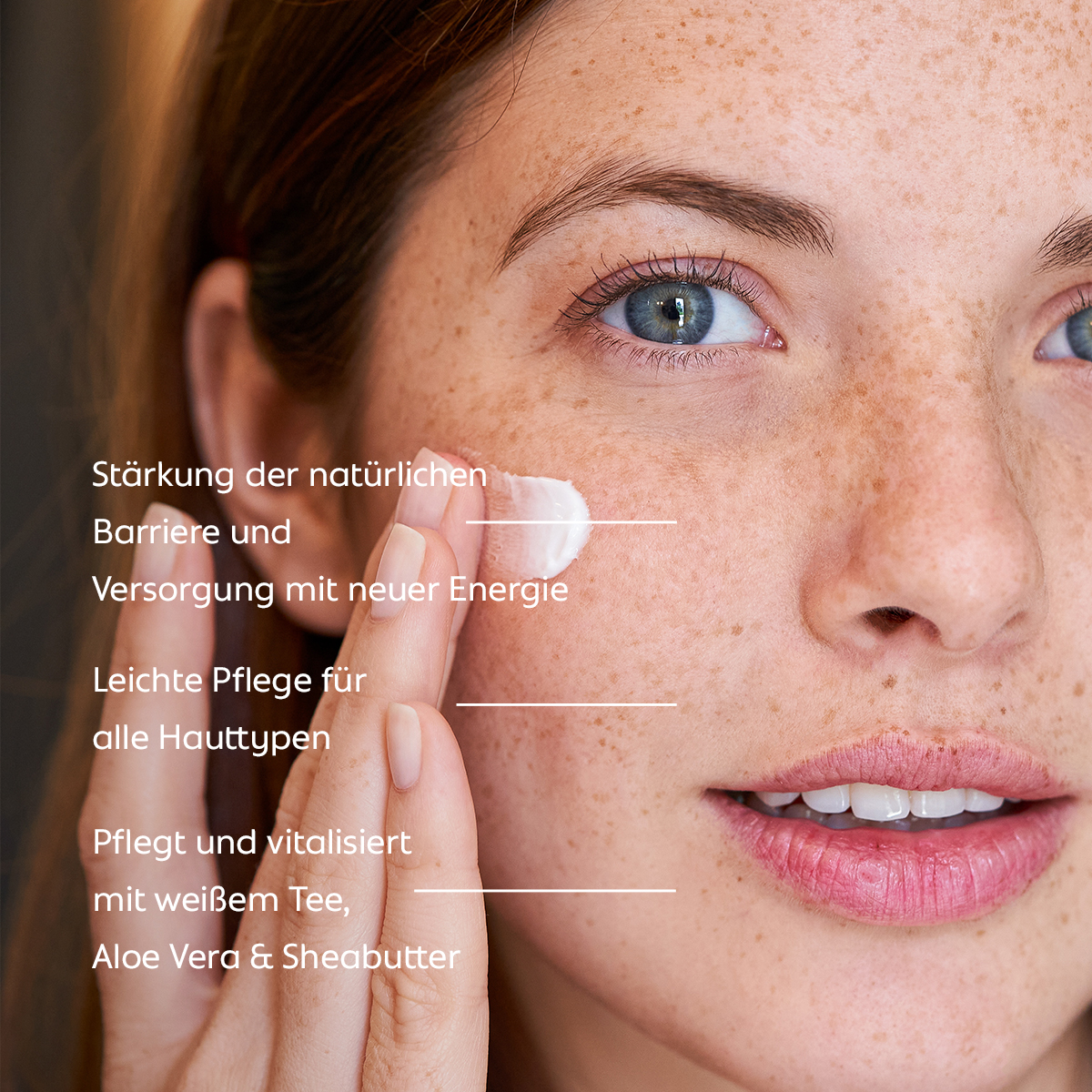 Auf Gesicht, Hals und Dekolleté auftragen und sanft einmassieren.