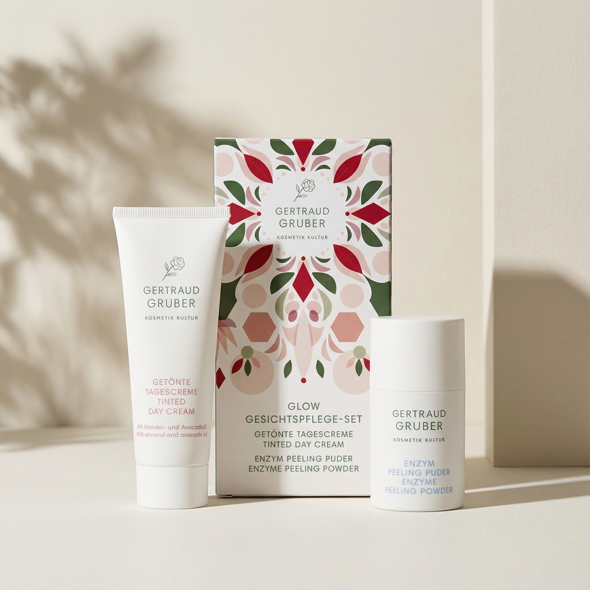 Ein gepflegter Teint braucht nicht viel – nur das Richtige. Das Glow Gesichtspflege-Set bringt Ihre natürliche Ausstrahlung zum Leuchten: Die GETÖNTE TAGESCREME sorgt für ein ebenmäßiges Hautbild mit sanfter Tönung, ganz ohne Make-up-Gefühl. Gleichzeitig wird die Haut sanft mit Feuchtigkeit versorgt und das ENZYM PEELING PUDER befreit die Haut sanft von abgestorbenen Hautzellen und überschüssigem Talg.