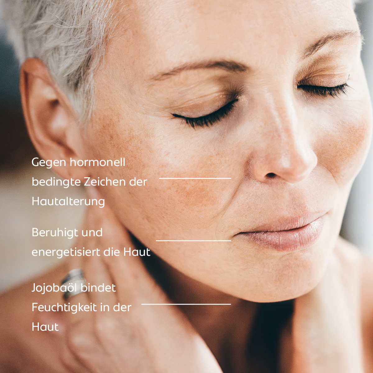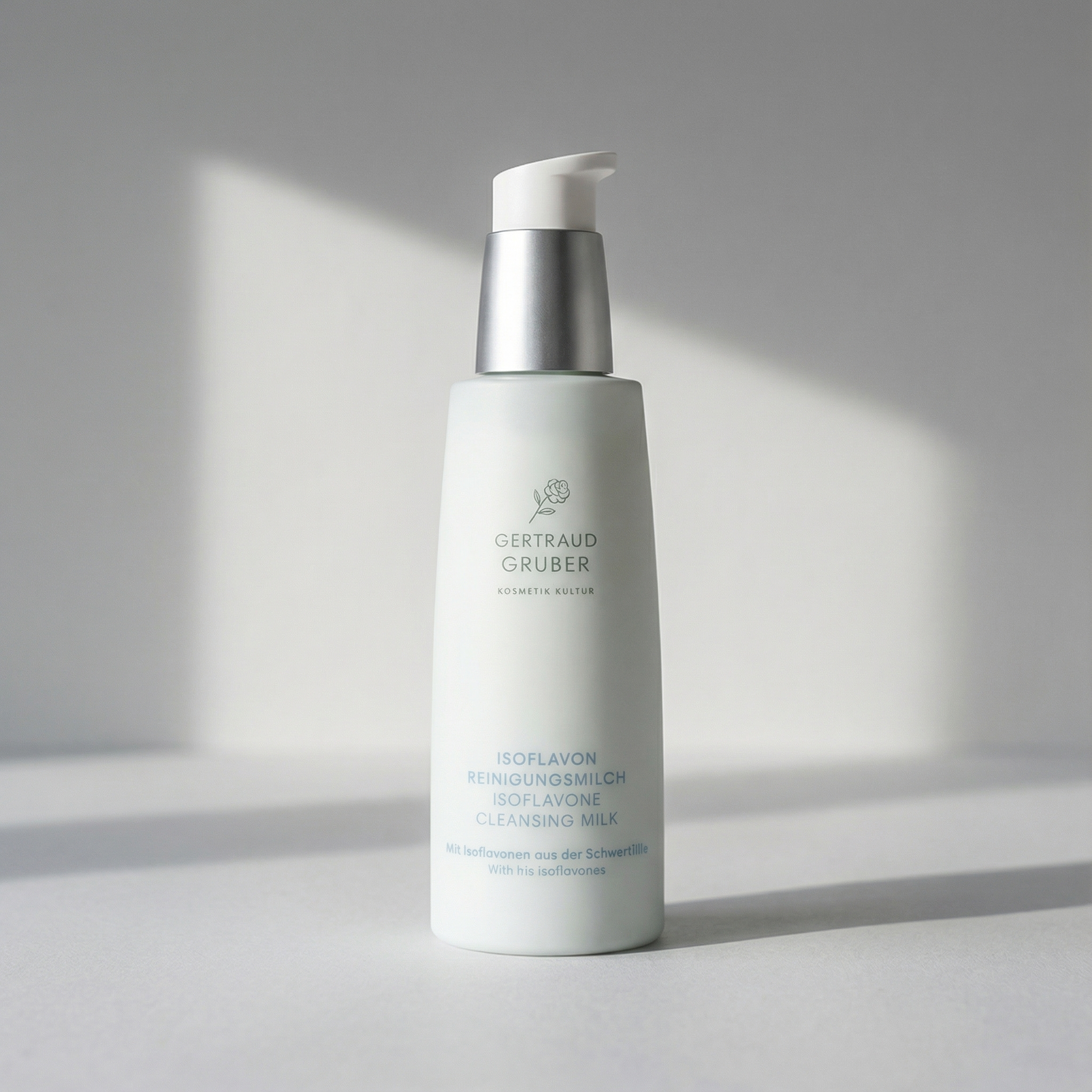 Spüren Sie, wie die ISOFLAVON REINIGUNGSMILCH Ihre Haut sanft umschmeichelt und dabei gründlich von Schmutz und Make-up befreit. Isoflavone aus der Schwertlilie stärken die Zellstruktur und helfen, hormonell bedingten Zeichen der Hautalterung entgegenzuwirken. Sie sorgt schon während der Reinigung für ein geschmeidiges, samtiges Gefühl und bereitet die Haut optimal auf die nachfolgende Pflege vor.