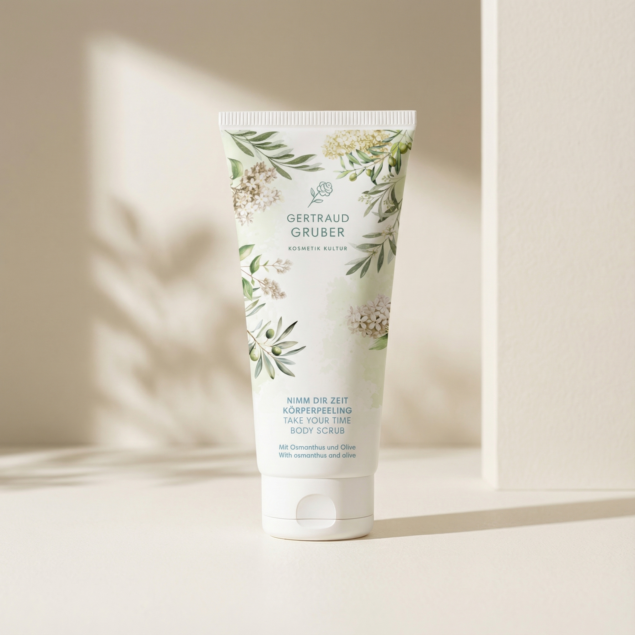 Ein Moment der Ruhe, der die Haut spürbar verwöhnt: Das NIMM DIR ZEIT Körperpeeling vereint fein gemahlene Olivenkerne, naturbasierte Upcycling-Wirkstoffe aus der Olive und den zarten Duft von Osmanthus-Blüten. Die Haut wird behutsam verfeinert, intensiv genährt und zugleich beruhigt. Das Ergebnis ist ein seidig glattes Gefühl, das angenehm nachklingt.