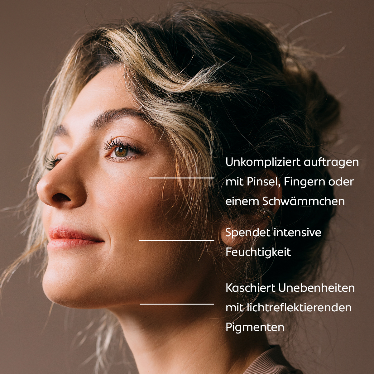 Diese Foundation lässt sich ganz unkompliziert mit den Fingern, einem Schwämmchen oder Pinsel auftragen – je nachdem, wie viel Zeit Sie haben und welchen Effekt Sie wünschen. Tragen Sie das Produkt von der Gesichtsmitte nach außen auf und arbeiten Sie es sanft ein. Der Teint wirkt ebenmäßig und gepflegt, ohne maskenhaft zu wirken. Für ein besonders glattes Ergebnis empfiehlt sich als Basis eine leichte Pflege.