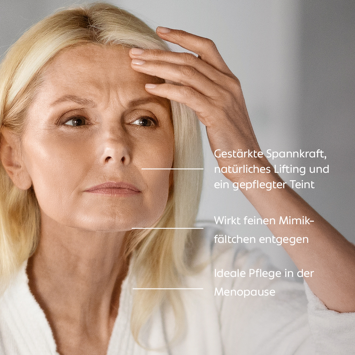 In der Menopause braucht die Haut unterstützende Impulse, um ihre Spannkraft und Leuchtkraft zu bewahren. SYMPHONIE NATURELAX umhüllt sie wie eine sanfte Melodie, die ausgleichend wirkt und neue Energie verleiht. Ein patentierter Wirkstoff aus Hibiskussamen entspannt die Gesichtsmuskulatur und mildert feine Mimikfältchen. Gleichzeitig wird die Collagenproduktion angeregt, wodurch die Haut spürbar gefestigt und elastischer wird.